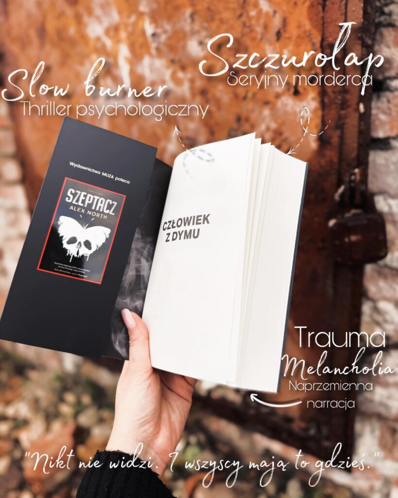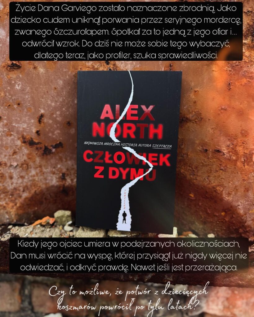Pamiętam, jak dziś ten dziki szum, gdy wychodził „Szeptacz”. Choć nie miałam jescze bookstagrama i swoje wybory książkowe opierałam głównie na wpisach z grup czytelniczych oraz polecajkach pierunwieskądjeszcze, to ten tytuł dosłownie wyskakiwał na mnie zewsząd i szeptał natarczywie – kup i czytaj. Oczywiście długo szeptać nie musiał, bo jego motywy totalnie do mnie przemawiały i wiedziałam, że przepadnę. Tak też się stało. Tamtego czasu byłam nim oczarowana i dosłownie zdominował moje myśli. Premiera „Człowieka z dymu”, czyli najnowszego thrillera psychologicznego Alexa North przywróciła te ciary ekscytacji, które wówczas mi towarzyszyły.