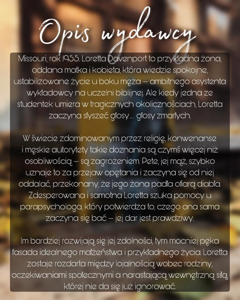 Warto zaznaczyć, iż „Diabeł i Pani Davenport” stanowi idealny przykład powieści, która wpasuje się w gusta czytelników totalnie zróżnicowanej gatunkowo literatury. Znajdziecie w niej nie tylko gotycki sznyt, będący hołdem dla twórczości Shirley Jackson, ale również studium psychologiczne tłamszonej w męskim świecie kobiety, która zaczyna słyszeć głosy zmarłych. Jest przykładną żoną i matką, wiedzie spokojne życie u boku szanowanego asystenta wykładowcy na uczelni biblijnej, a tego typu doznania z zaświatów mogą przysporzyć jej jedynie dodatkowych problemów… Mąż oczywiście jej nie wierzy i uznaje jej przypadłość za diabelskie moce mające związek z nawiedzeniem, co gorsza – w grę wchodzą również domniemania dotyczące choroby psychicznej. Nie wiadomo, która z tych furtek okazuje się dlań bezpieczniejszą opcją – jedno jest pewne – w męskim, zdominowanym przez społeczne i religijne konwenanse świecie, Pani Davenport musi szukać pomocy na własną rękę.