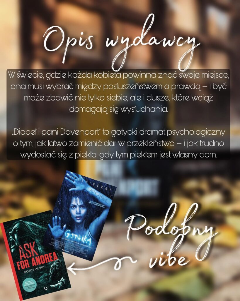 Ten psychologiczny dramat, który rozgrywa się w idealnie nakreślonym kontekście historycznym, z ciekawie zarysowanym tłem obyczajowym uderza brutalnością brudnych intencji. Autorka udowadnia, że tytułowy diabeł tkwi w ludzkich żądzach i jest bliżej nas, aniżeli moglibyśmy sobie wyobrażać. Powieść niesie znamiona takich tytułów jak „Gothika” oraz „Ask for Andrea”, które osobiście uwielbiam. Diabelsko polecam😈