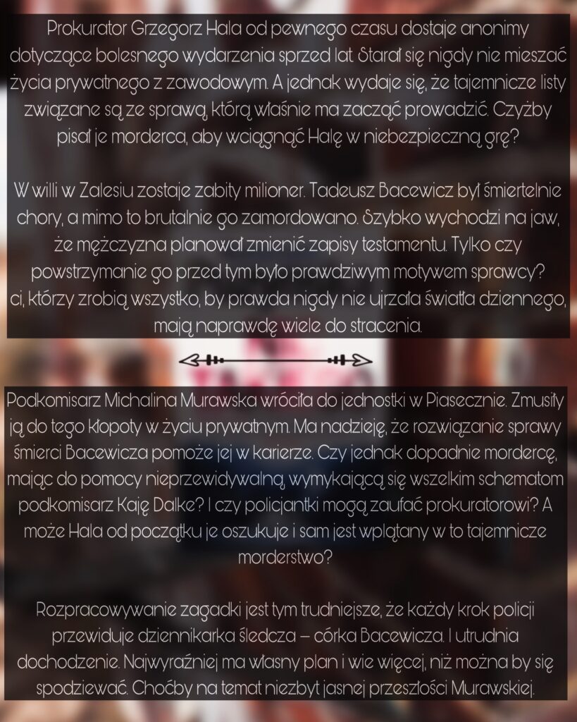 Tym razem fabułę otwiera brut4lne m0rderstwo bogatego biznesmena, co od razu otwiera furtkę dla rozważań nad jego testamentem. Sprawę poprowadzi Michalina, Piggy oraz Grzegorz Hala, który tworzą niezły, charyzmatyczny team. Wiele osób z otoczenia ofi4ry okazuje się mieć powody do dopuszczenia się zbr0dni, a liczne tropy prowadzą do traumatycznych wydarzeń z przeszłości.