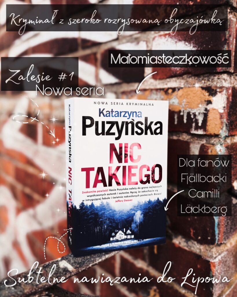 „Nic takiego” Katarzyny Puzyńskiej stanowi pierwszy tom zupełnie nowej serii kryminalnej o Zalesiu. Mamy tutaj kolejne małomiasteczkowe podejście do prowadzonej narracji, czyli nawarstwienie problemów natury obyczajowej i kryminalnej na relatywnie niewielkim terenie i w małej grupie społecznej. Każdy zdaje się znać każdego, a koneksje rodzinne wiążą spore grono bohaterów. Ciekawym zabiegiem w tej historii jest nawiązanie do najbardziej popularnej, kilkunastotomowej serii autorki, tj. cyklu o Lipowie, który z pewnością znany jest przez większość fanatyków literatury z motywem detektywistycznym w naszym kraju. Odniesienia do Lipowa nie są jednak na tyle nachalne, że wymagana jest znajomość całości treści tych obszernych woluminów, aczkolwiek stanowią one swego rodzaju „mrugnięcie oczkiem” w stronę zaznajomionych z tematem czytelników.