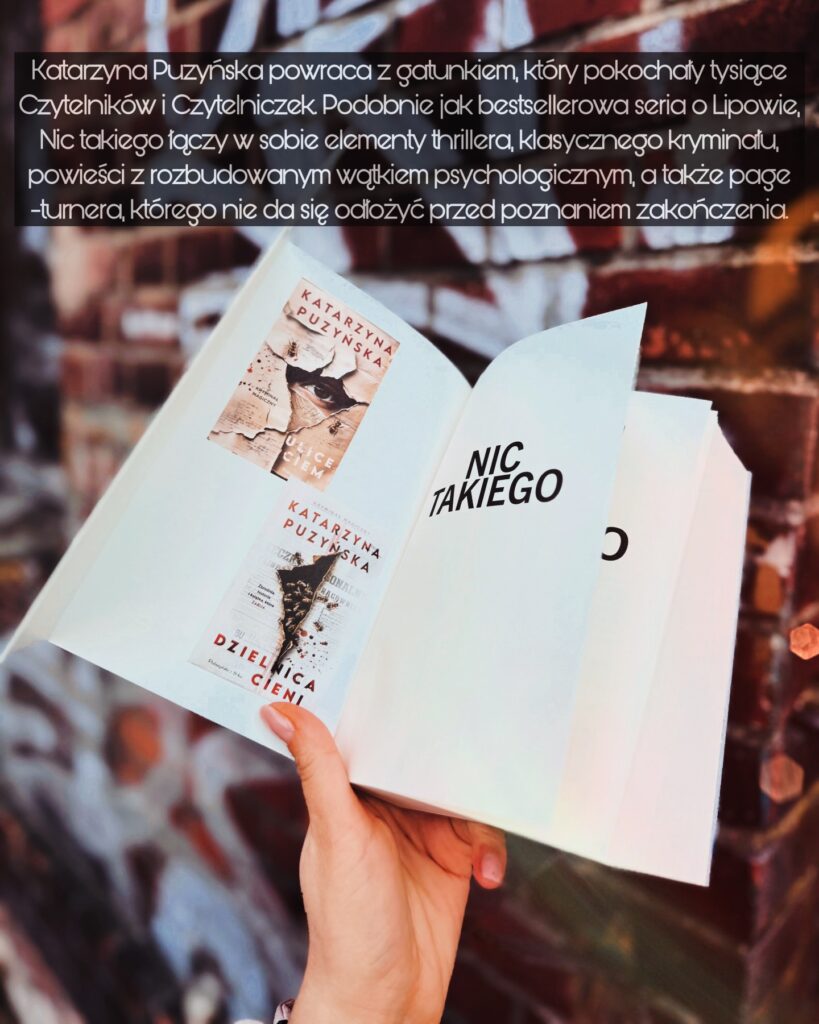 Katarzyna Puzyńska ma wybitnie lekkie pióro, jej książki pomimo treściwej obszerności czytają się dosłownie same. Ma swego rodzaju magnetyzm, którym przyciąga mnie do swoich historii i zatrzymuje w zaangażowaniu fabularnym na dłużej. Relacje międzyludzkie w „Nic takiego” charakteryzuje naturalność, a intryga jest jak zwykle wybitnie zagmatwana. Krótkie rozdziały zakończone cliffhangerami nie pozwalają na odłożenie książki, bez sięgnięcia po jeszcze jeden rozdział.