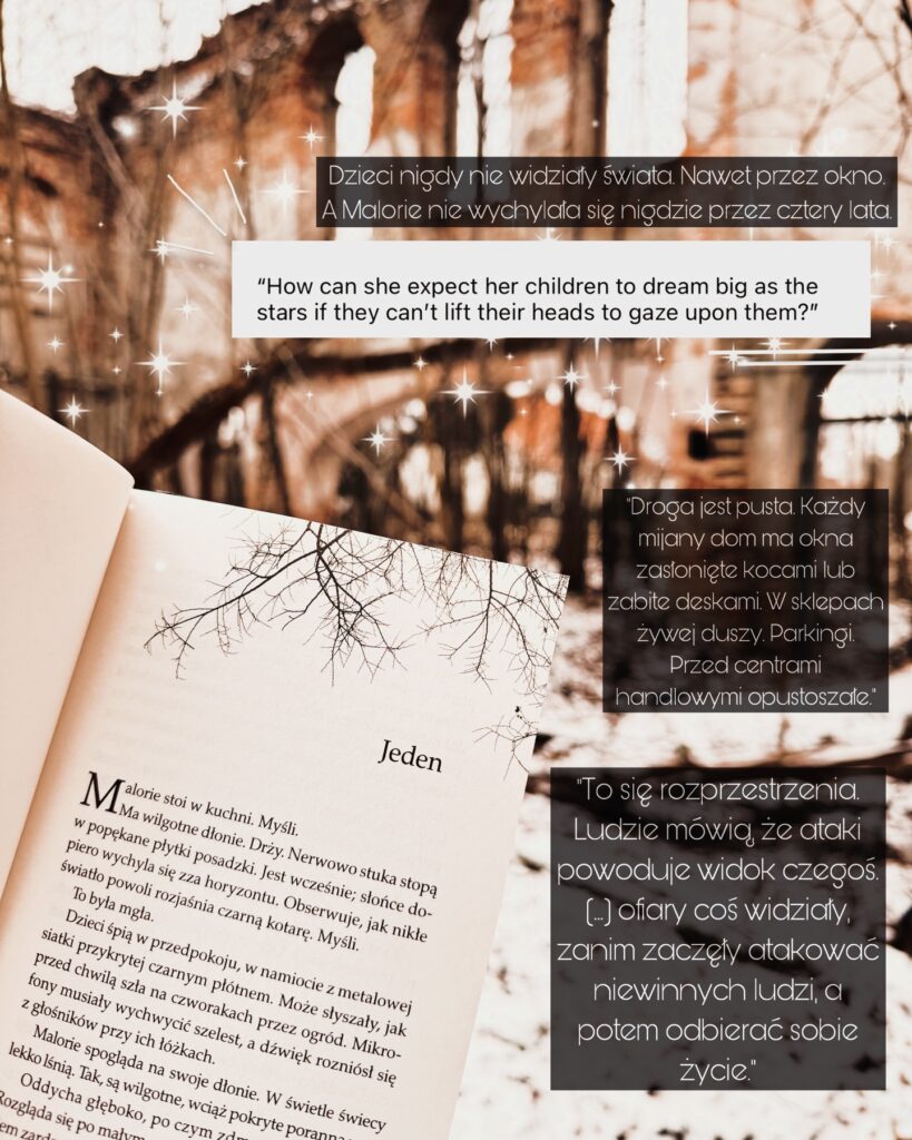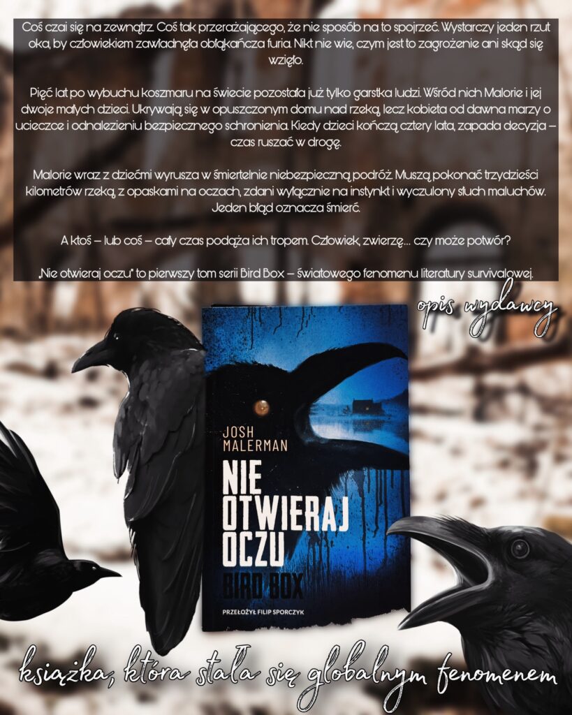 Opowieść Malorie poznajemy w ramach dwóch okresów – gdy dowiedziała się o ciąży, a świat dopiero zaczynała pochłaniać panika oraz cztery lata później, podczas przeprawy przez rzekę z dwójką dzieci. Czteroletni chłopiec i dziewczynka bez wątpienia wprowadzają w tej historii ogromny ładunek emocjonalny, a samozaparcie Malorie i jej wewnętrzna walka o utrzymanie dzieci przy życiu są co najmniej imponujące. Fenomenalna kreacja głównej bohaterki, jak również wszystkich postaci pobocznych nie pozwala przechodzić przez trudności na kartach powieści bezemocjonalnie. Malerman po raz kolejny pokazał, że potrafi snuć mrok między wersami, kreować przerażające zło, bez użycia konkretów, bezobrazowo. Choć ani razu nie nazwał istoty siejącej spustoszenie, ani nie opisał jej natury – cały czas była ona wyraźnie wyczuwalna, podążająca za bohaterami krok w krok. Nie mogę doczekać się kontynuacji, po którą będziemy mieli okazję sięgnąć już niebawem.