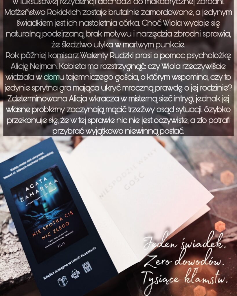 Książki Agaty Zamarskiej od dłuższego czasu chodziły za mną, aż w końcu za sprawą „Niespodziewanego gościa” miałyśmy okazję się zapoznać na kartach wykreowanej przez autorkę fabuły. Już na samym początku zaznaczę, iż spotkanie zaliczam do wysoce udanych i z pewnością będę nadrabiać poprzednie thrillery psychologiczne, które wyszły spod pióra Zamarskiej. Już powrzucałam audiobooki na półkę 👌