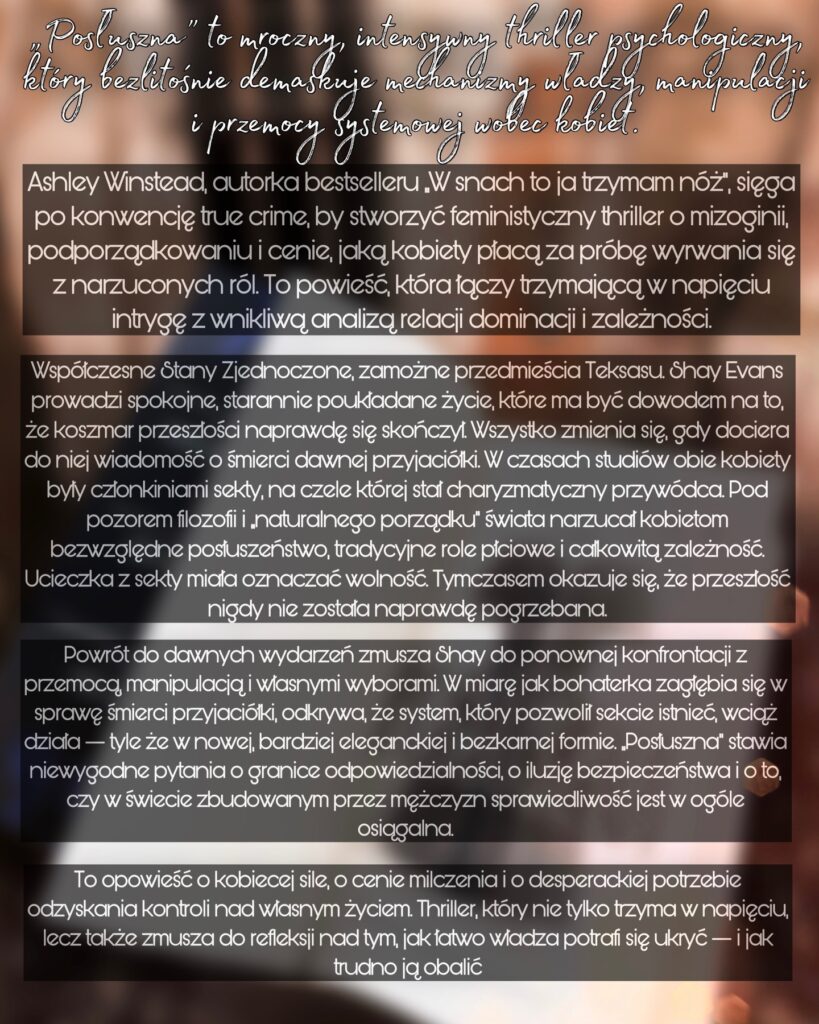 „Posłuszna”, to kolejny już w dorobku autorskim Ashley Winstead thriller psychologiczny poruszający kontrowersyjną tematykę. Mocny, dosadny, wchodzący z buta w świat manipulacji, patriarchatu i sekt bazujących na niemoralnych praktykach. Starsi mężczyźni z określonymi społecznie pozycjami, wykorzystujące młode dziewczyny… temat dość aktualny. Winstead rozbudowała ten motyw na szeroką skalę, pokazując od podszewki, w jaki sposób dziewczyny krok po kroku wpadają w sidła mroku. Dają się omotać, wykorzystać i pod płaszczykiem dobroci, opieki i pożądania popadają w niebezpieczną obsesję i całkowite uzależnienie. Pułapka, w której się znajdują okazuje się jednocześnie kusząca, a z drugiej strony krzyczy czerwonym światłem. Choć znaki alarmujące pojawiają się relatywnie szybko, ich reakcja niejednokrotnie jest albo zbyt opóźniona, lub zerowa. Jakkolwiek, Winstead postanowiła zaprezentować nam wielopoziomowe studium moralnie niejednoznacznych postaci po obu stronach barykady. Mężczyzn wykorzystujących swoje pozycje, by psychicznie omotać wokół siebie niewykształcone jeszcze dziewczynki, z licznymi traumami i problemami wywodzącymi się z domów rodzinnych. Zaburzone relacje rodzinne po raz kolejny wychodzą tu na front i stanowią podłoże do linii narracyjnej, która skupia się na powielaniu złych schematów.
