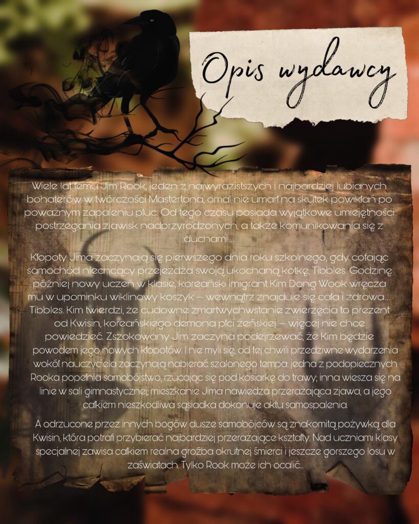 Tym razem Graham Masterton sięgnął do kultury koreańskiej, wskrzeszając demona płci żeńskiej zwanego Kwisin. Byt ten wziął sobie za cel dusze samo5ójców, rzucając tym samym poniekąd klątwę nad klasą Rooka. Uczniowie staną w bardzo niebezpiecznym położeniu, o czym przekonamy się dość prędko, gdy jedna z ofiar demona postanowi rzucić się pod kosiarkę i targnąć się na swoje życie.